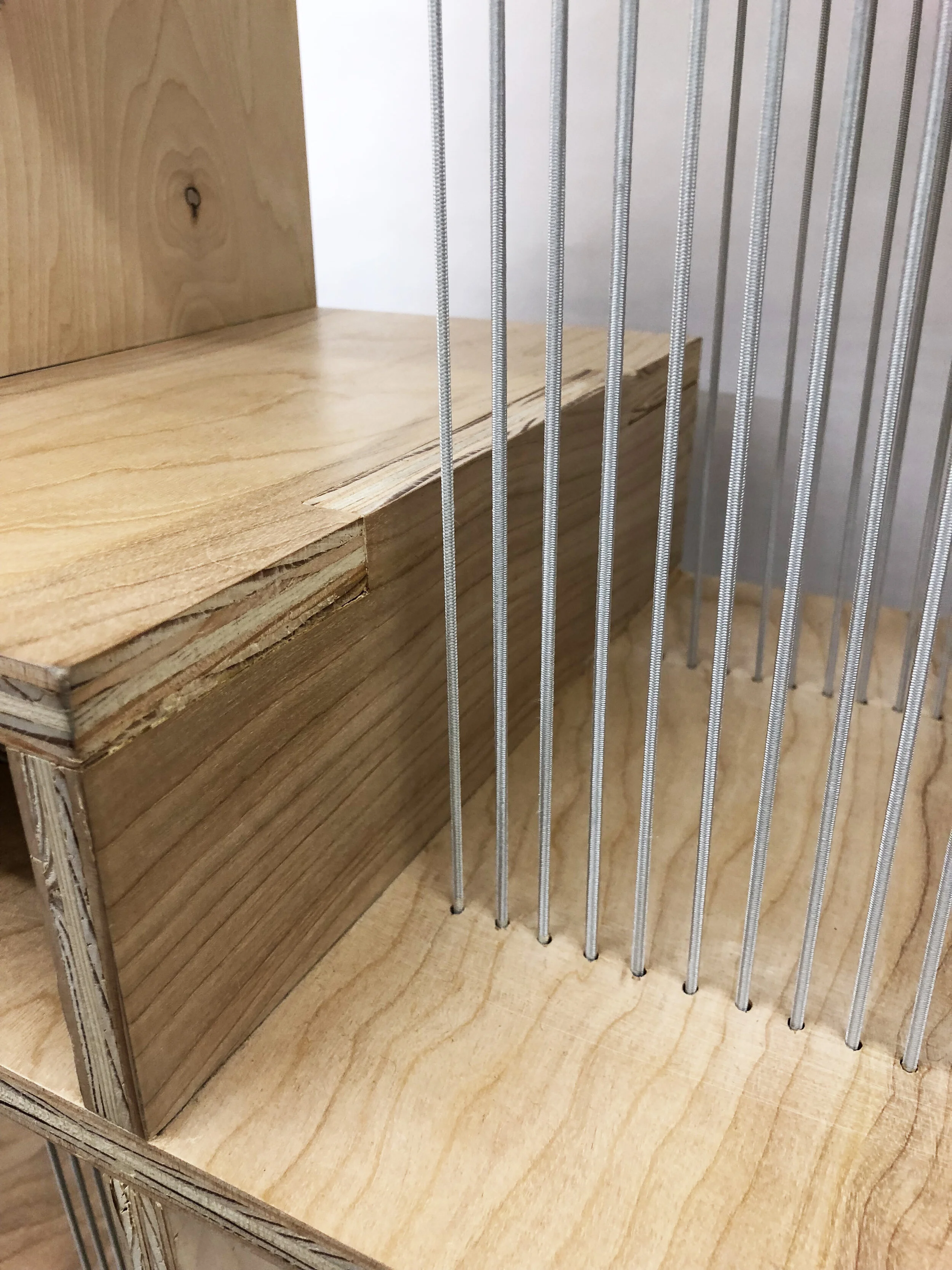This shelfie is every vinyl-head’s dream. Thinking about the act of listening to a record and everything involved with that determined the design of this shelf. A place to store the records, a place to open the player, a place for display of the current vinyl playing, it has it all. Cut and built to look like two intersecting rectangles, the simple lines of this piece are cut by the elastic threads zigzagging their way around and through, constantly drawing the eye (and ear) around.